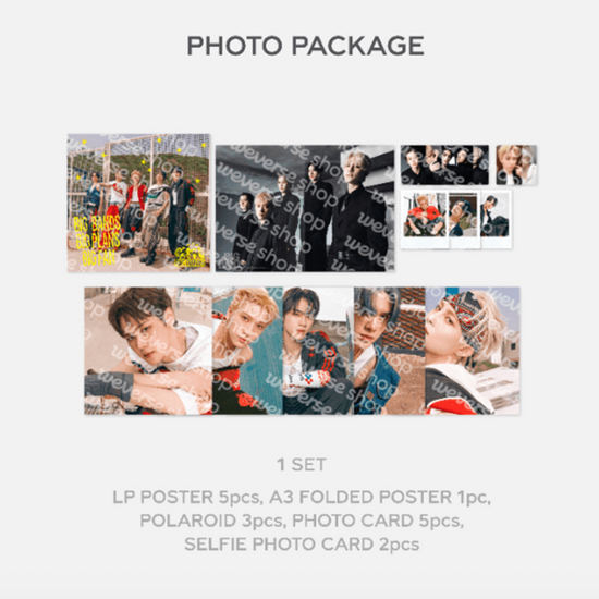 Contents: Photo Package ( LP Poster 5pcs, A3 Folded Poster 1pc, Polaroid 3pcs, Concept Photo Card 5pcs, Selfie Photo Card 2pcs )