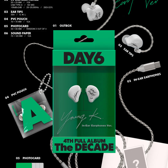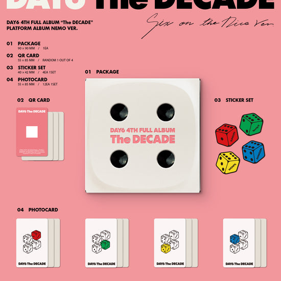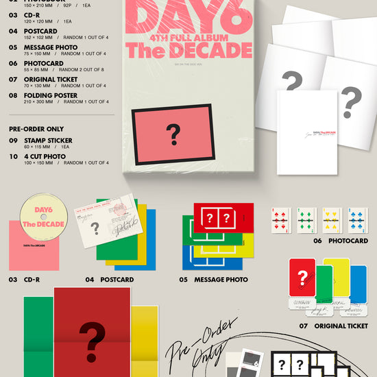 Introducing the DAY6 - THE DECADE 4TH ALBUM STANDARD RANDOM, a must-have for every K-pop enthusiast and music lover. Celebrating a monumental journey, DAY6's latest release encapsulates a decade of musical evolution and artistry. This album features a collection of new and powerful tracks that showcase the band's signature blend of emotive lyrics and dynamic instrumentals, resonating deeply with fans old and new. The STANDARD RANDOM edition offers a surprise element with its randomly selected cover and exclusive photo cards, adding a personal touch to your collection. Immerse yourself in the rich soundscape and celebrate the legacy and future of DAY6 with THE DECADE. Perfect for those looking to experience the authentic sound of a decade-long journey, all in one beautiful, collectible package.