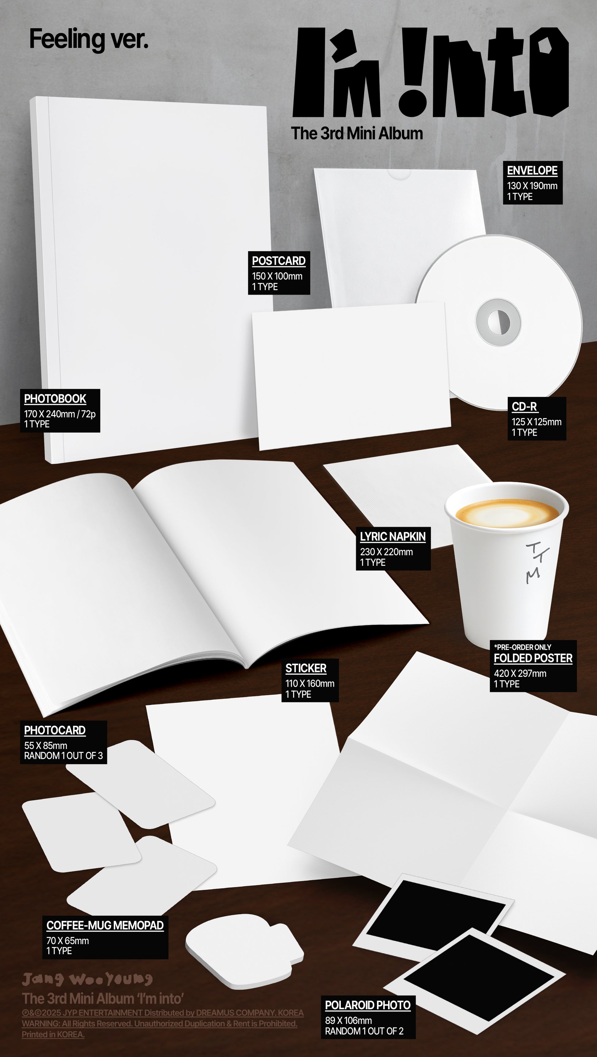 The JANG WOOYOUNG - I'M INTO 3RD MINI ALBUM is a must-have collection for fans and music enthusiasts alike. Dive deep into the captivating world of Wooyoung's artistry with this beautifully curated mini album, featuring a harmonious blend of vibrant tracks and soulful melodies. The standard set not only includes the stunning audio experience but also offers exclusive fan content such as a vibrant photo book, collectible photocards, and a unique poster that captures the essence of Wooyoung's dynamic style. Perfect for both new listeners and longtime fans, this mini album is a testament to Wooyoung's musical evolution and creative spirit. Elevate your music collection with this special edition that resonates with passion and artistry.