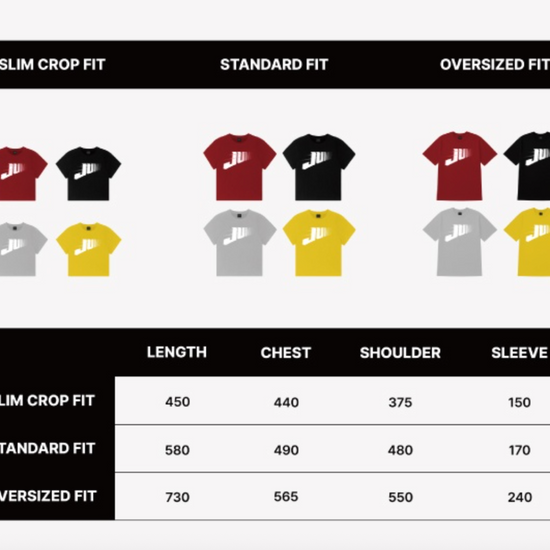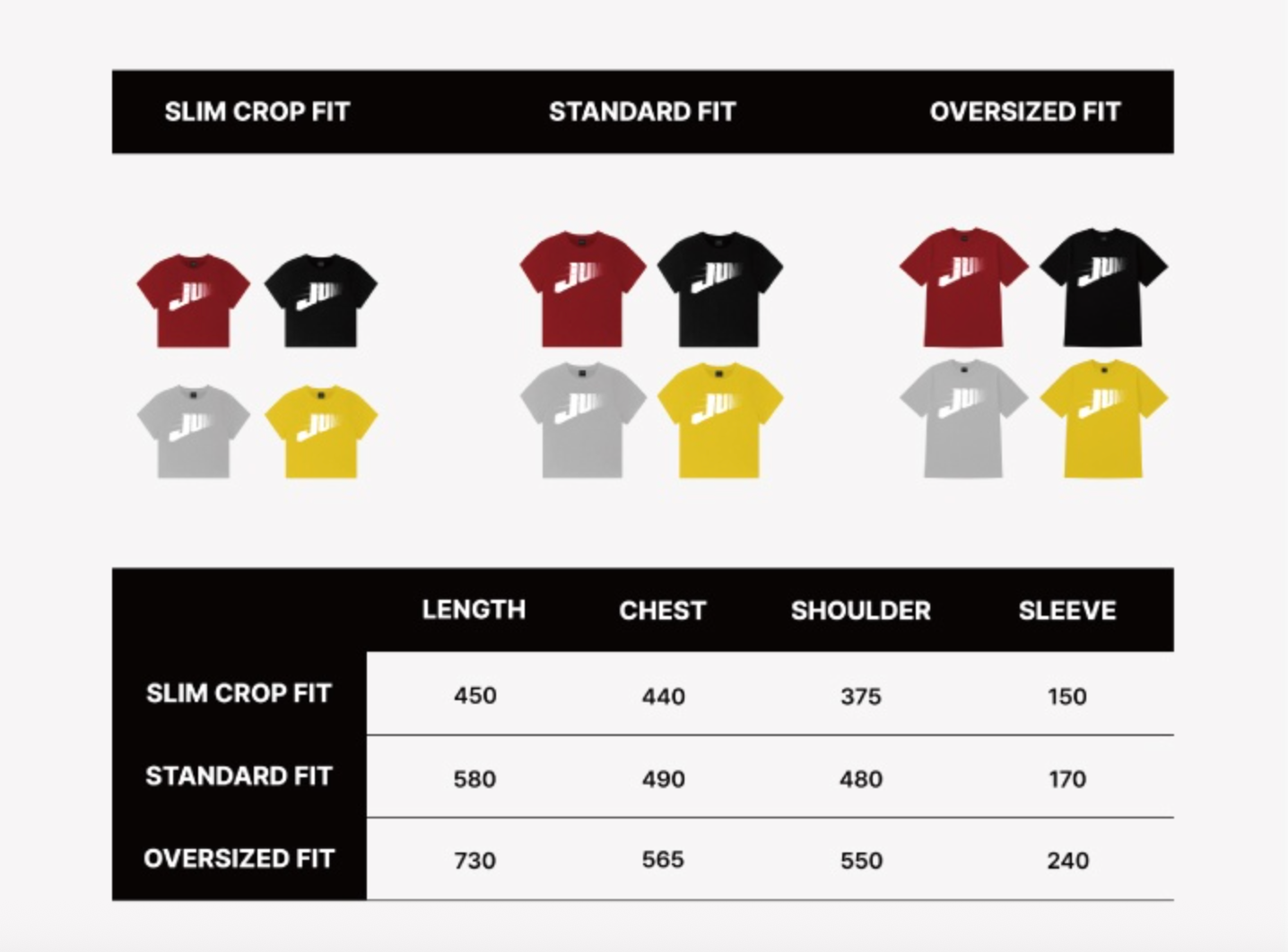 Size(mm): SLIM CROP FIT : LENGTH 450 CHEST 440 SHOULDER 375 SLEEVE 150 STANDARD FIT : LENGTH 580 CHEST 490 SHOULDER 480 SLEEVE 170 OVERSIZED FIT : LENGTH 730 CHEST 565 SHOULDER 550 SLEEVE 240