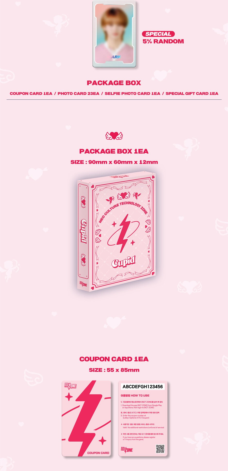 Introducing the NCT ZONE COUPON CARD (CUPID VER), a must-have for every NCTzen! This exclusive, limited-edition card is your golden ticket to an immersive NCT experience, designed with love and packed with perks. Featuring a stylish, romantic design inspired by Cupid himself, the card grants holders access to special discounts, early-bird concert tickets, exclusive merchandise, and members-only fan events. Each CUPID VER card is crafted with premium materials, making it a perfect collectible item for dedicated fans. Celebrate your passion for NCT and step into their vibrant world with this enchanting coupon card. Don't miss the chance to make your NCT journey even more magical!