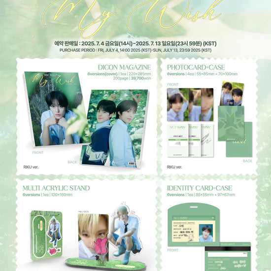 NCT WISH - Dicon Volume N29 is a stunning collector's edition dedicated to the dynamic world of NCT, the renowned South Korean boy group celebrated for its innovative approach to music and performance. This beautifully crafted volume offers a deep dive into the vibrant universe of NCT, complete with exclusive interviews, behind-the-scenes content, and captivating photography that captures the essence of each member's unique charisma and style. Perfect for both new fans and dedicated followers, NCT WISH provides an intimate glimpse into the group's journey, showcasing their remarkable talent and the creative spirit that propels them forward. This edition is a must-have for anyone wishing to connect with the heart and soul of NCT.