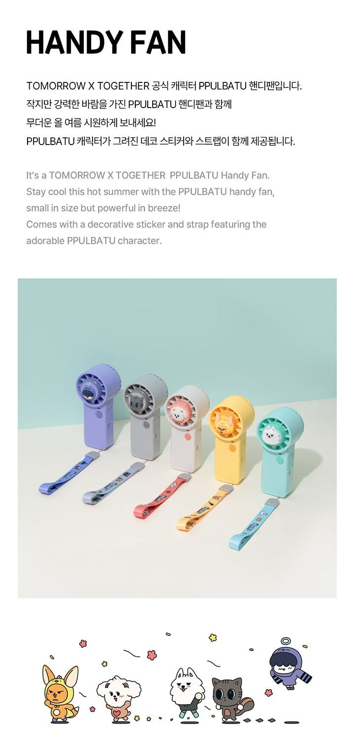 Introducing the TXT - PPULBATU Official MD Royche Handy Fan, a must-have accessory for fans of TOMORROW X TOGETHER and anyone in need of a convenient cooling solution. This compact, portable fan combines functionality with fandom, featuring a sleek design emblazoned with exclusive TXT graphics. Its rechargeable battery provides long-lasting performance, perfect for on-the-go refreshment during concerts, outdoor events, or everyday activities. Lightweight yet powerful, the Royche Handy Fan offers multiple speed settings, ensuring you stay cool and comfortable no matter where you are. Stay stylish and refreshed with this official merchandise, a practical and trendy addition to any TXT fan's collection.